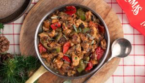 .Φτιάξτε μια πιο γιορτινή εκδοχή της κλασικής τηγανιάς κοτόπουλου με τζίντζερ, κανέλα, πορτοκάλι, μοσχοκάρυδο, φασκόμηλο και σταφίδες και αφήστε το σπίτι να μυρίσει Χριστούγεννα!