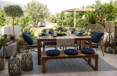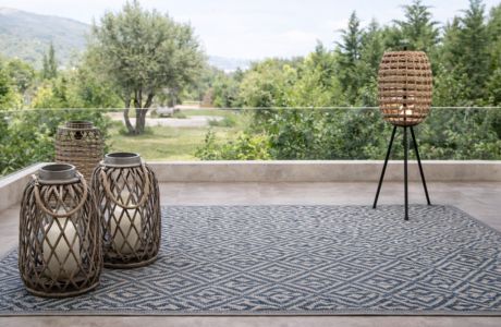 Ένα χαλί εξωτερικού χώρου ενοποιεί τα έπιπλα και ορίζει την τραπεζαρία. Φροντίστε να πατούν επάνω του τα βασικά κομμάτια. Μην καλύπτετε ολόκληρη τη βεράντα από άκρη σε άκρη. Το χαλί πρέπει να λειτουργεί σαν πλαίσιο, όχι σαν κάλυψη.